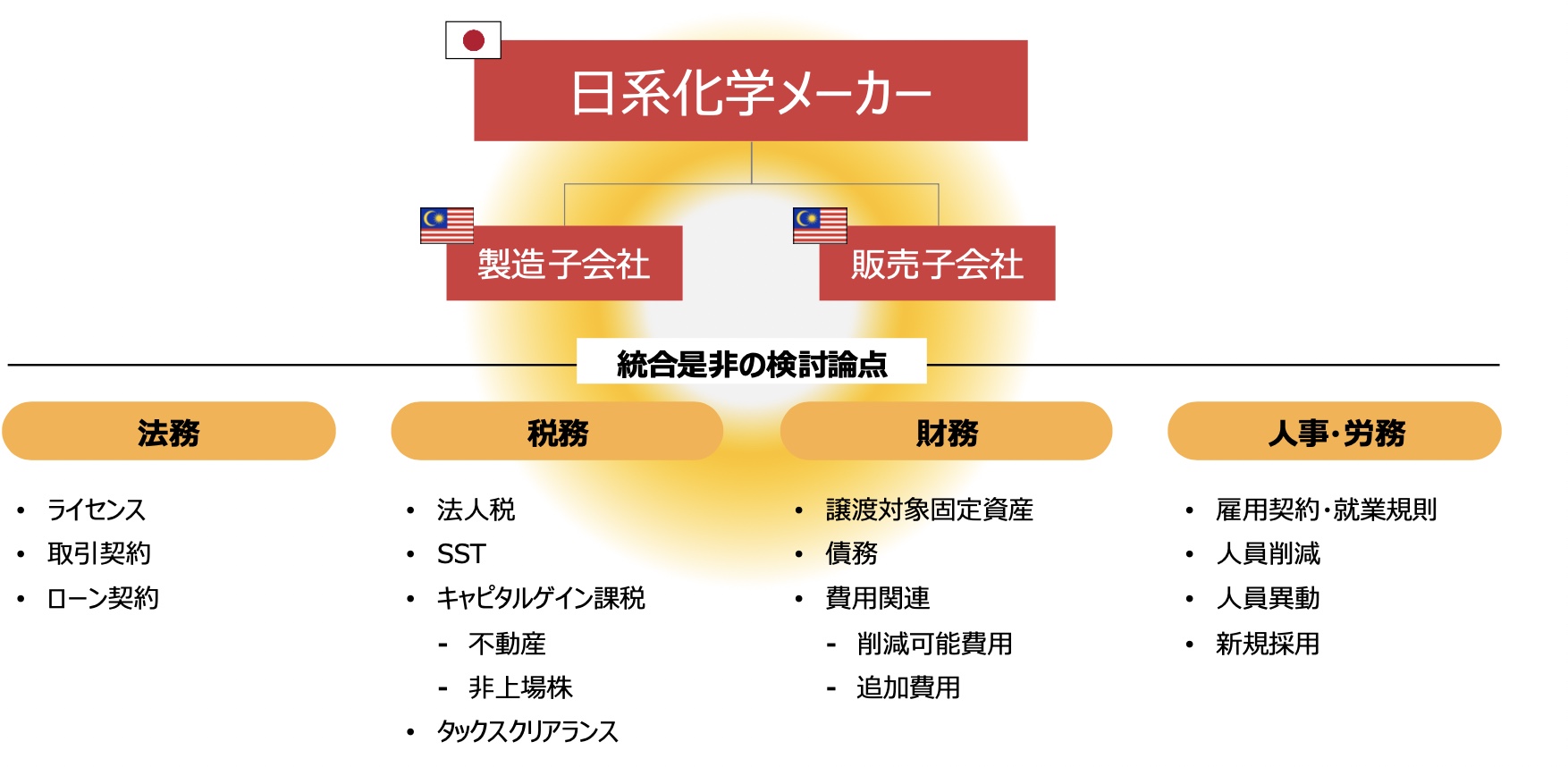 組織再編実施の是非について、複数のシナリオを想定し、法務・税務・財務・人事労務など網羅的に検討を支援